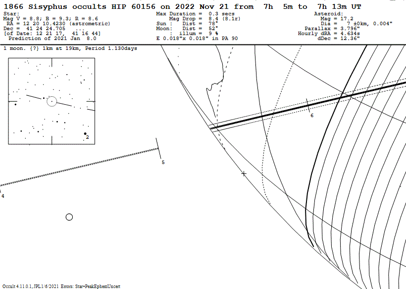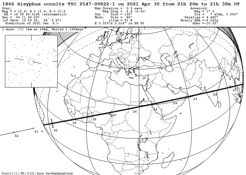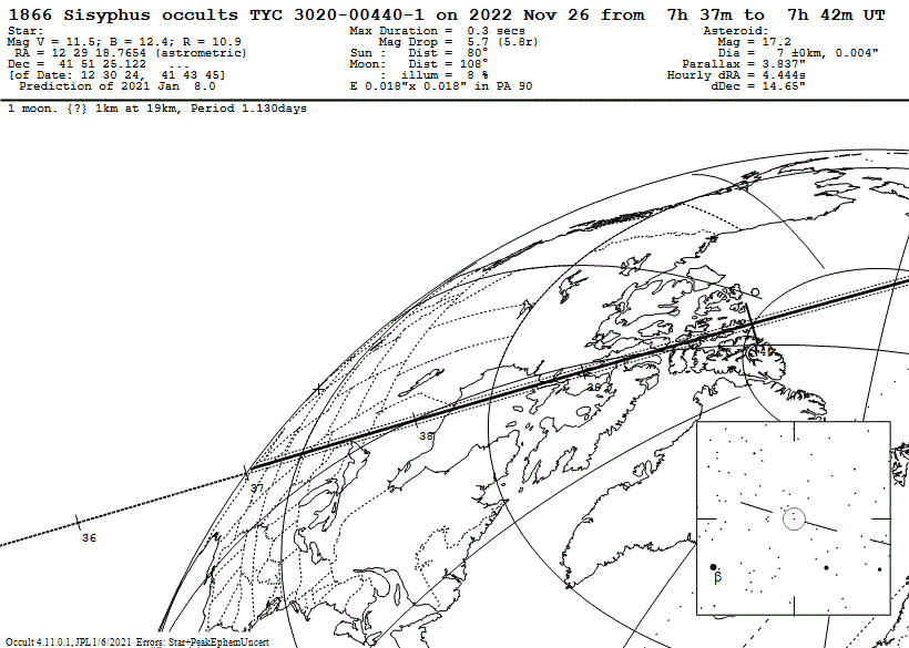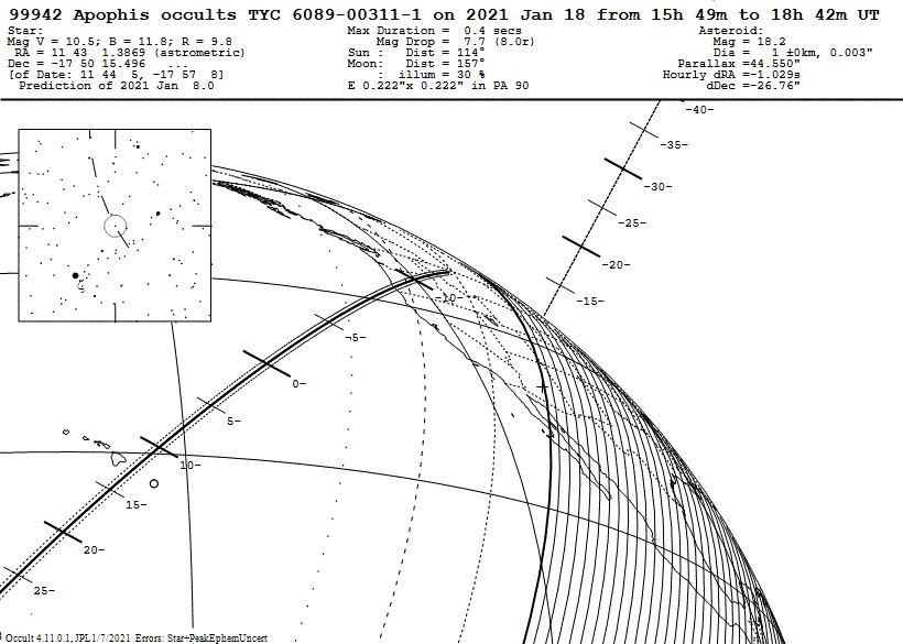 Occultations by the 6-km asteroid (3200) Phaethon were successfully observed in July, September, and October, 2019, and in October 2020, enabling a substantial improvement of Phaethon's orbit and a determination of its small non-gravitational acceleration (apparently due to shedding of Geminids meteroids from its surface caused by the extreme thermal stress of its close perihelion passes) to an accuracy of 10 sigma, three times better than previous determinations. Here is a press release about the Phaethon occultations, the first observed occultations for a relatively small near-Earth object (NEO). Links to presentation and other files giving much more information about the Phaethon occultations, and results from observations of them, are given on this Web page. I have conducted a search for occultations by other NEO's. As luck would have it, three events by the threatening asteroid (99942) Apophis will occur over parts of North America during the next several days, including one over the eastern USA Monday morning, Jan. 11, around 9:50 UT (4:50am EST). Unfortunately, the cloud cover forecast is rather poor over the path area, but not hopeless; maybe an observer will be lucky with both the weather and the occultation. But Apophis is about 400m across, more than 10 times smaller than Phaethon, and the current JPL orbit errors are rather large. But the fact that the small Yarkovsky effect on Apophis' orbit has been detected, I believe shows that a more accurate ephemeris might be possible to reduce the large occultation path errors, but maybe not in time for these occultations, especially the one Monday morning. There are radar observations, but I don't know if Apophis was bright enough to be observed by Gaia for its asteroid observations for DR2. The stars for the Apophis occultations aren't bright enough to generate the large interest, or justify organizing a large campaign, like the one for the 7th-mag. occultation by Phaethon on 2019 July 29, but observers near the paths for these events with telescopes large enough to record the short possible events with a reasonable signal-to-noise (S/N) ratio are encouraged to try. Steve Messner has placed the events in Occult Watcher's (OW's) North American "low-mag." feed, but to see them there, note that the diameter is 1 km (and that' rounded up from 0.5 km; the actual maximum dimension is 370m), so you need to select the OW diameter limit to be 1 or 0. In the table below, clicking on the link for the date and time will bring up an Occult- generated map of region, as seen looking towards the Earth from the direction to the target star. Above the map is a header with some of the more important information about the occultation. Clicking on the location information for the event will bring up an interactive Google map for it. There are several events that were found in my Occult search, just to mag. 11 since the fainter stars can't give a good-enough S/N to reliably detect an occultation, that I've eliminated from the table below for various reasons, including the entire path only over the daytime hemisphere of Earth, or the event visible in too bright twilight and/or only from high-latitude Arctic or Antarctic regions with no known observers. You can use IOTA's free Occult4 software to generate details of all of the events I found, using this "occelmnt" .xml Occult4 input file. Keep in mind that the times in the table below are for the time of geocentric closest approach; the times for locations in the path on the Earth's surface can be many minutes earlier or later, due to the slow motion of Apophis as it's near a stationary point in R.A. _____________ Occultations by (99942) Apophis, 2021 January Date U.T. Diam. Dura- Star dMag Elon Star Moon R.A. (J2000) Dec. y m d h m " tion mag V o No. Dist ill Location h m s o ' " 2021 Jan 11 10 46.4 0.003 0.4s 10.9 7.6 107 TYC 6093-00809-1 85 4% Ont.,MI-nwFla. 11 44 3.957 -16 23 58.04 2021 Jan 16 11 31.6 0.003 0.4s 10.6 7.7 112 TYC 6086-00002-1 146 12% B.C.,wWA-nwCal. 11 43 46.759 -17 25 33.77 2021 Jan 18 17 15.5 0.003 0.4s 10.5 7.7 114 TYC 6089-00311-1 157 30% nwMont.-Oregon 11 43 1.387 -17 50 15.50 Besides Apophis, my searches also found 3 occultations by the 7-km NEO (1866) Sisyphus, another Earth-crossing asteroid (with a safe MOID of 0.104 AU) that can't be observed by radar until 2046. I'll provide Google map links for them later. I also searched for occultations by the 4-km potentially hazardous NEO (2102) Tantalus, but found no observable events involving it through the end of 2023. Occultations by (1866) Sisyphus, 2021-2022 Date U.T. Diam. Dura- Star dMag Elon Star Moon R.A. (J2000) Dec. y m d h m " tion mag V o No. Dist ill Location h m s o ' " 2021 Apr 30 21 25.4 0.005 0.3s 10.6 6.4 130 TYC 2547-00822-1 85 81 sTH,India,SA,GH 13 58 28.016 34 11 36.30 2022 Nov 21 7 9.3 0.004 0.3s 8.8 8.4 78 HIP 60156 52 9 s.Brazil (low) 12 20 10.423 41 24 24.71 2022 Nov 26 7 39.7 0.004 0.3s 11.5 5.7 80 TYC 3020-00440-1 108 8 wOnt.,MN-wTX 12 29 18.765 41 51 25.12 The astrometric data for all of the stars is from Gaia Data Release 2 (DR2), which normally have negligible errors of well under a milli-arc-second, or less than a km in the path location on the ground. _________________ David Dunham, 2021 January 9 e-mail: dunham@starpower.net; cell phone: 301-526-5590
