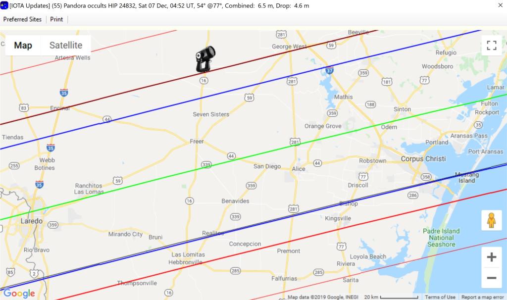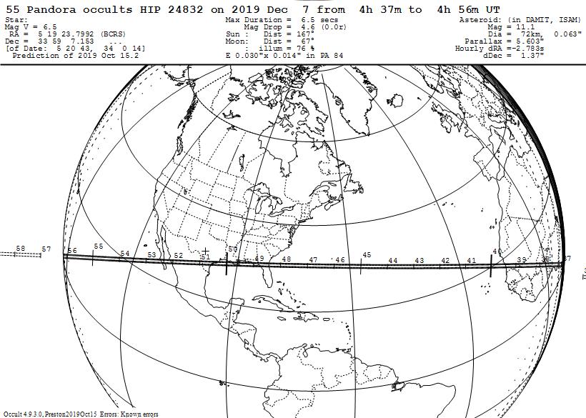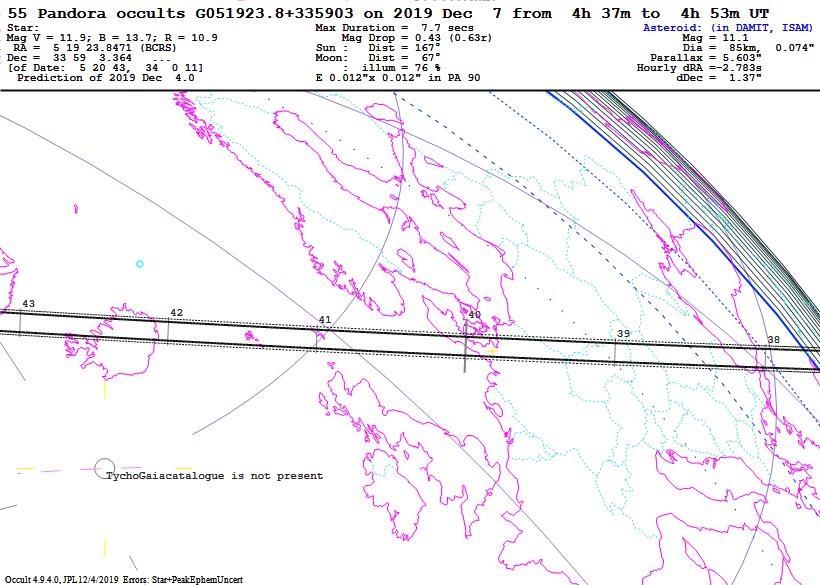 https://occultationpages.com/events/20191207_55_Pandora.html . It gives near the top, the link to Steve Preston’s page for the event, with his finder charts and other event details. Preston recently updated his prediction to match JPL orbit solution #71 which in turn was updated by Davide Farnocchia, now including Gaia DR2 observations of Pandora. The new path is almost identical to the previous one computed by Preston, but the errors are smaller; unluckily, the Gaia error ellipse is elongated in the direction perpendicular to the path, so it’s 12 km 1-sigma, still a good result in which I believe we can have good confidence, considering the good agreement with Preston’s independent result, and the great result (error less than 2 km) for the July 29th Phaethon occultation whose orbit was so successfully updated by Farnocchia by similar means.