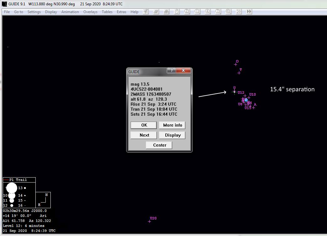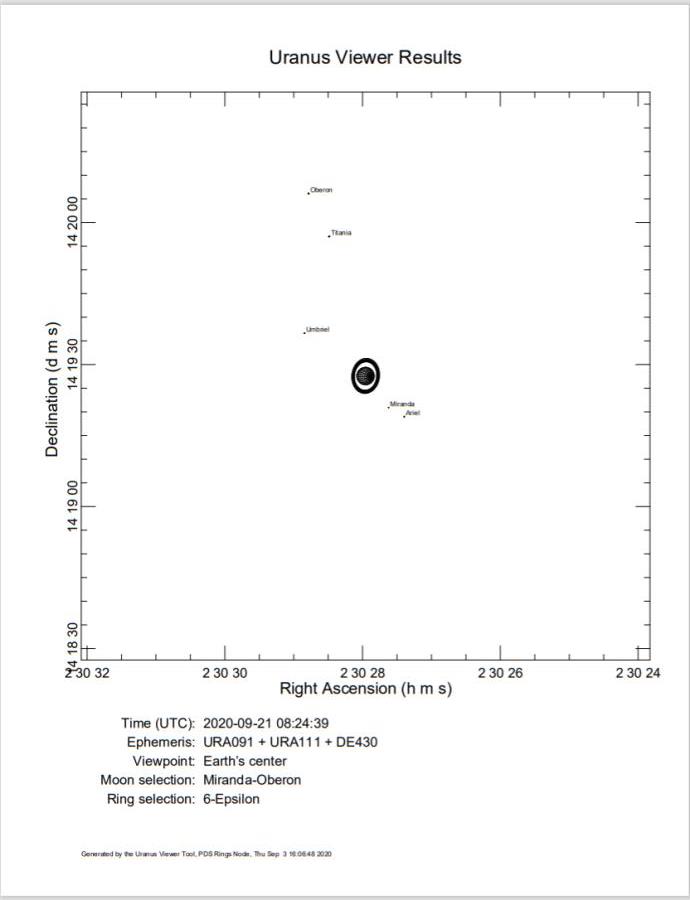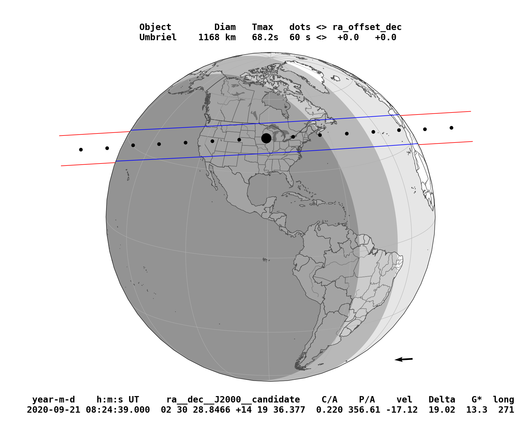 P7M02 Umbriel, a moon of Uranus will occult a mag 13.4 star the early morning of 21 Sept 2020. Umbriel has a diameter of 1169 km, 0.085", so the shadow path will be quite wide across North America: Northern USA and sub-arctic Canada. In the east, the predicted path should extend from central ME to northern QE; in the west from N. CA to central BC. The uncertainty bands are slightly less than a diameter, and extend from Baffin Island to VA and SE AK to S.CA.